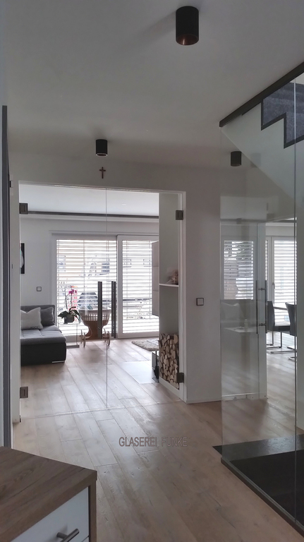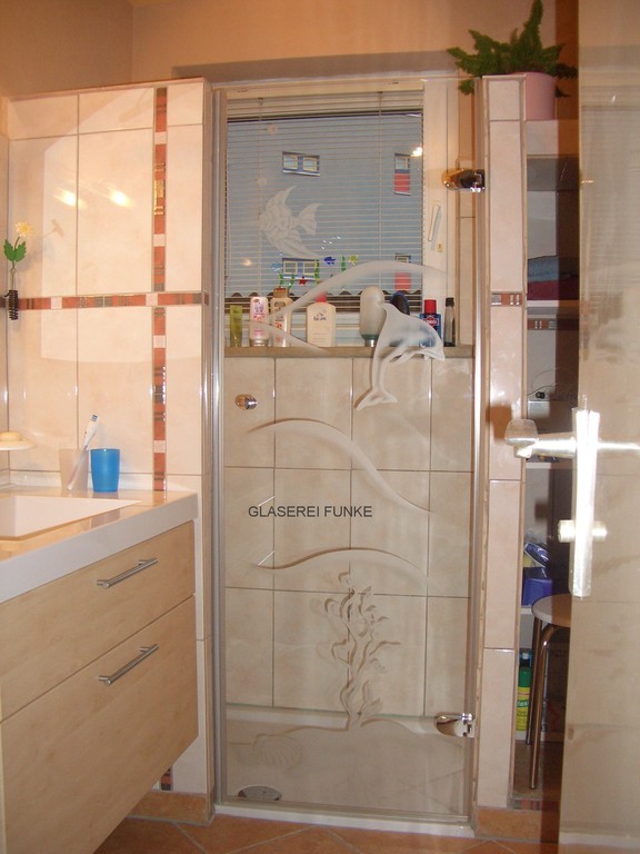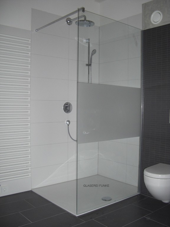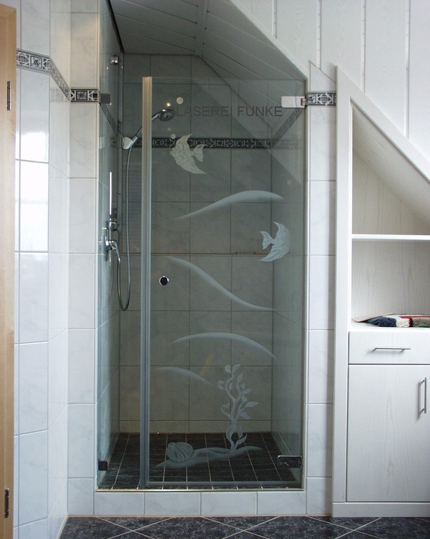 Rahmenlose Ganzglasdusche mit flächenbündigen Beschlag und Dekorarbeit "Blase",